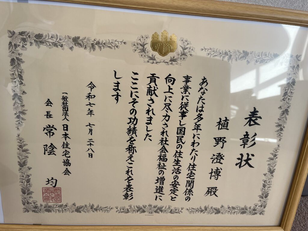 先日、日本住宅協会より表彰状を頂きました。